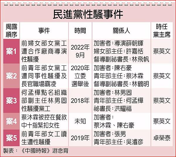 民進黨前婦女部黨工遭合作導演性「輝哥」騷擾事件,正在延燒,至目前為止已有五起性騷案。2日黨主席賴清德震怒,上午約10時許赴黨中央開會;民進黨祕書長許立明下午親開記者會,率黨務主管起身兩度鞠躬道歉。而這5件綠營性騷案《中時新聞網》也整理出事件的始末,讓讀者一次看懂!