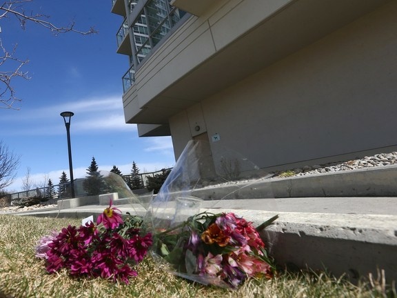 4月18日星期二,卡爾加里西南部 Spruce Cliff 的公寓大樓外擺放著鮮花