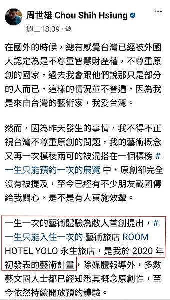 丁春誠最近的策展作品「一生只能預約一次的展覽」,被藝術家周世雄直指非原創,認為是他二創自己二年前「一生只能入住一次的藝術旅店」的創作概念,在臉書發文怒批。
