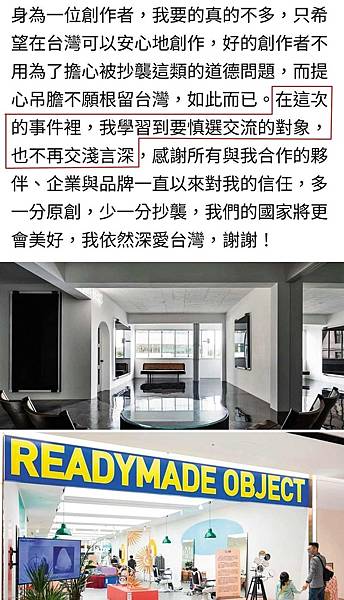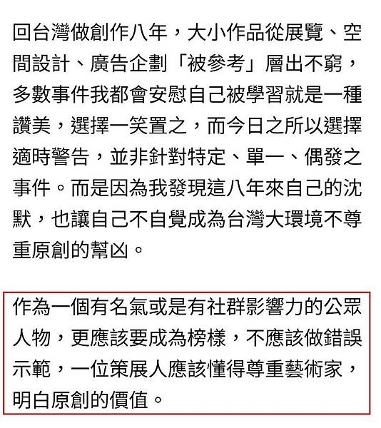 周世雄直批:「作為一個有名氣或是有社群影響力的公眾人物,更應該要成為榜樣,不應該做錯誤示範,一位策展人應該懂得尊重藝術家,明白原創的價值。在這次的事件裡,我學習到要慎選交流的對象,也不再交淺言深。」