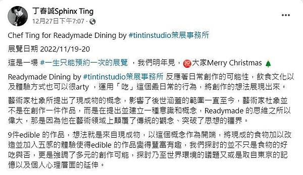 這二年丁春誠全力發展藝術策展事業,經營的丁丁藝廊到處征戰國內外藝展與引進藝術家作品。2022年11月底由名經紀人陳鎮川擔任發行人、邁入第6屆的《MONSTER PARTY》「怪物祭」,他也是獲獎人之一。不過他日前舉辦的Readymade Dining展覽,遭當代鬼才藝術家周世雄控「移花接木、整碗端走」!