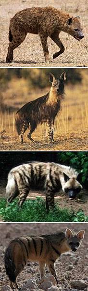 鬣狗科動物,由上而下:斑點鬣狗、棕鬣狗、條紋鬣狗、土狼