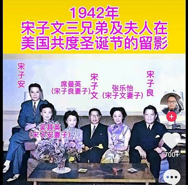 前排中為倪桂珍,前左為宋美齡,前右為宋靄齡,其後為依次為宋子良、蔣介石、孔祥熙與宋子安