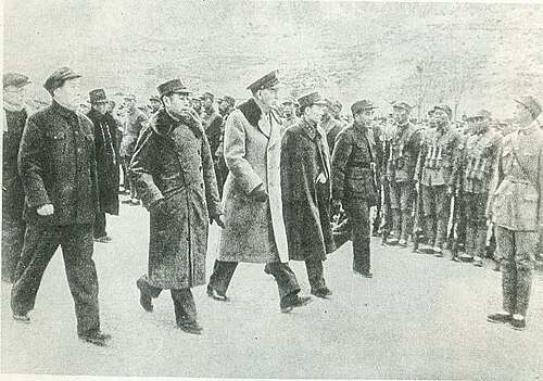 1946年3月4日,毛澤東和朱德在延安陪同馬歇爾、張治中、周恩來三人停戰小組檢閱部隊