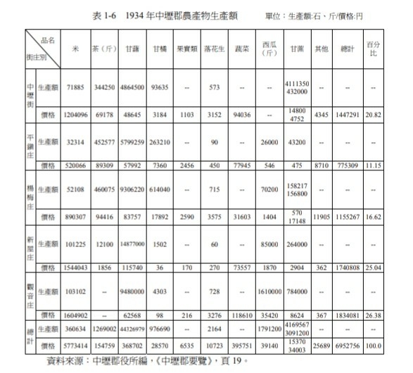 不過,受到土壤貧瘠的影響,中壢十三庄的農業發展,從清代到日治,還是不如南桃園的楊梅、新屋、觀音來得發達,我們可以從下表1-5中壢郡耕地面積與表1-6中壢郡農產物生產額的相互比較得到答案。