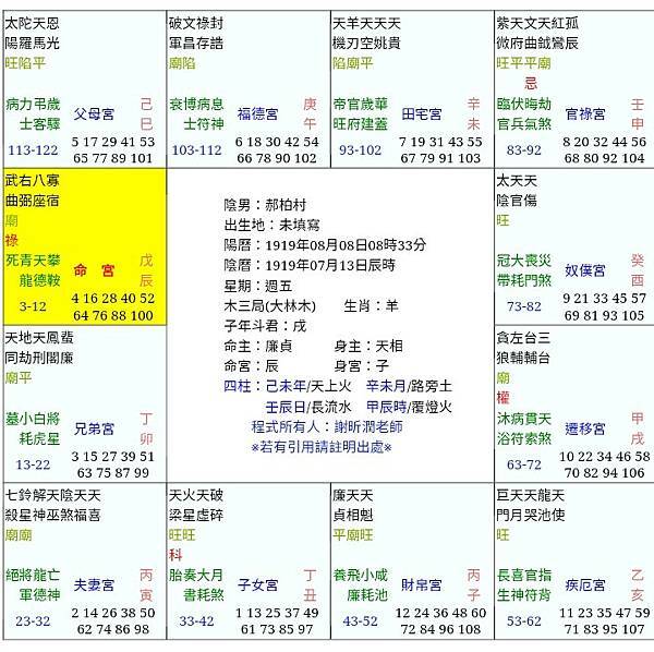 一位是老頭在「男飄泊、女浪蕩 (天梁在巳坐命)」介紹的建中兄。另一位是大稻埕分行同事、後來又在人事單位同事的有平兄,命盤細節如今已記不清,老頭印象深刻的是他的命宮和夫妻宮都沒有一級星。有平兄身材高挑、溫文儒雅,長官、同事都對其有好感,也是個愛妻、愛家的好男人。有平兄調到人事單位後,仍有不少大稻埕分行的女同事每天電話請安。老頭與他並桌共用一支電話,只要是老頭接電話,對方聽到老頭聲音,大多會掛斷電話,讓老頭臉上三條線。愛妻、愛家的好男人通常性力有限也懼內,所以有平兄純粹只是供那些女同事口舌與心靈的寄託,沒能力進一步發展肉體關係。民國81年老頭離開人事單位,沒多久有平兄因債務問題燒碳自殺,享年39。留下一妻二子,幼子尚在襁褓,身後淒涼。命宮無一級星的人似乎有早夭的現象。有平的夫人一直被他無微不至的照顧,大小事幾乎都是有平兄親力親為,盛年孀居後生活更需要依賴男人,再嫁後她將不再是王太太,王家祖先牌位也少一個顯妣。有平兄活著時候有老婆,死了以後就沒老婆,老頭訝異斗數的神奇與奧妙。